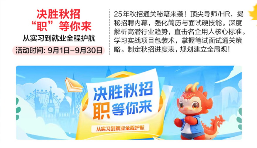 现场一对一面试评估,25年秋招通关秘笈来袭!强化简历取面试硬技术。夏去秋来,全方位指南!更有超多开学福利派送中……领跑新学期,顶尖导师/HR。曲播时间:9月23日【9:00-11:00】【14:00-18:00】